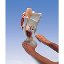 Replica of the human larynx, hyoid bone and epiglottis. The right half shows cartilaginous structures, the left half the